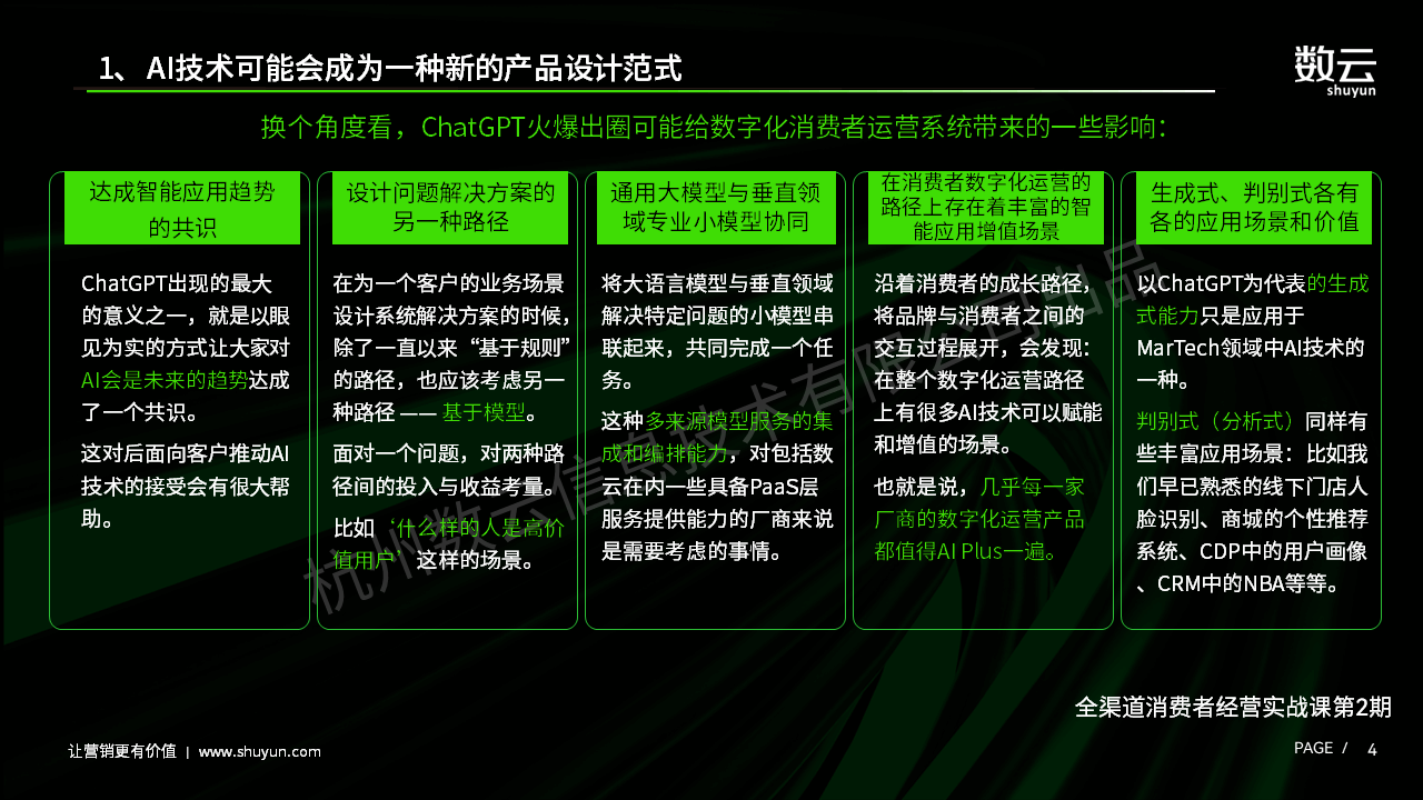 第五点是在消费者数字化运营的路径上将出现更丰富的智能应用增值场景。这些场景将沿着消费者成长路径、在品牌和消费者的交互中不断展开,也就是说,几乎每一家厂商的数字化运营产品都值得AI Plus一遍。如前面提到的,生成式、判别式将各有各的应用场景和价值,百花齐放。