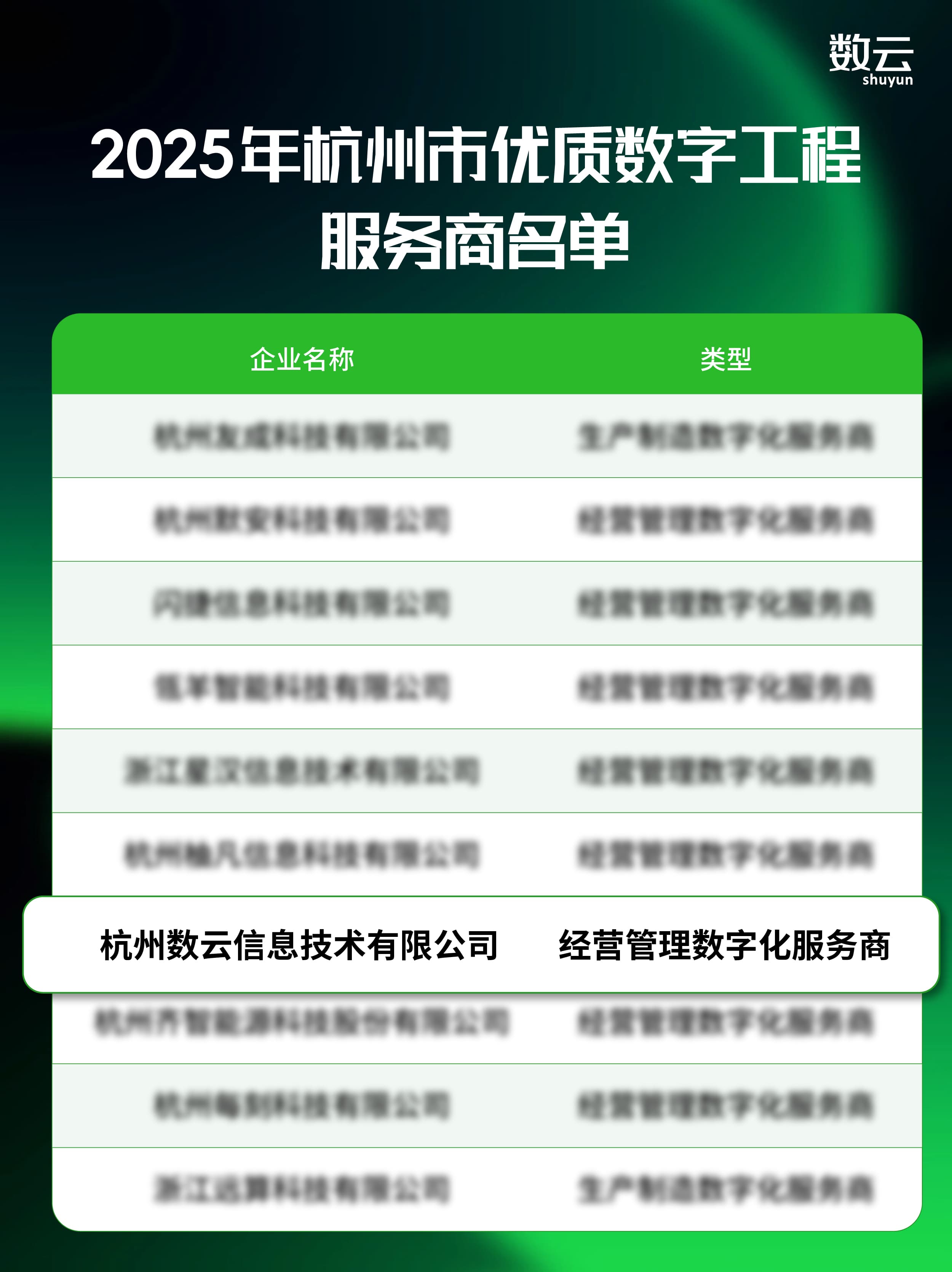 近日,杭州市经济和信息化局(杭州市数字经济局)正式公布了《2025 年杭州市优质数字工程服务商名单》。经过多轮严格评审,杭州数云信息技术有限公司(简称 “数云”)凭借在经营管理数字化领域的深厚技术积淀、卓越创新能力及行业标杆实践,成功入选获评“2025年杭州市优质数字工程服务商”,成为杭州市数字工程高质量发展的重要标杆企业之一。